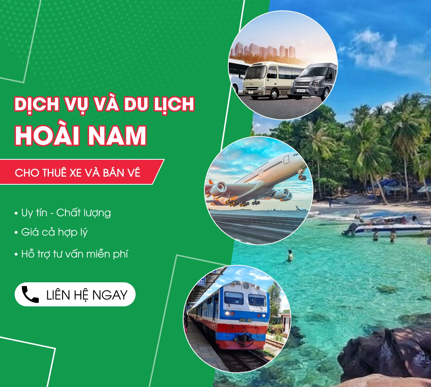 Công Ty TNHH Dịch Vụ Và Du Lịch Hoài Nam kính chào quý khách! Tự hào là đơn vị đi đầu về dịch vụ vận tải hành khách tại Đồng Nai. Hoài Nam chuyên cung cấp dịch vụ Xe du lịch, Xe đi tour, cưới hỏi, sự kiện…Đặc biệt, Nhận Đón trả tận nơi các bệnh viện, trường học, công nhân viên bằng các dòng xe từ 4 đến 45 chỗ đời mới, chất lượng cao. Ngoài ra, Hoài Nam còn là Đại lý uy tín cung cấp vé máy bay vé tàu hoả trong nước và quốc tế giá rẻ. Cùng đội ngũ nhân viên chuyên nghiệp, nhiệt tình . Cam kết đáp ứng hoàn hảo mọi nhu cầu của quý khách. Hotline: 0933.308.812 hoặc đến tại Địa chỉ: Số 1423/279, Tổ 19, Khu phố Vườn Dừa, Phường Phước Tân, TP.Biên Hòa, Tỉnh Đồng Nai. Công Ty TNHH Dịch Vụ Và Du Lịch Hoài Nam – Chất lượng tiên phong, dịch vụ xứng tầm!